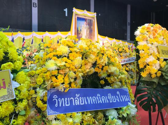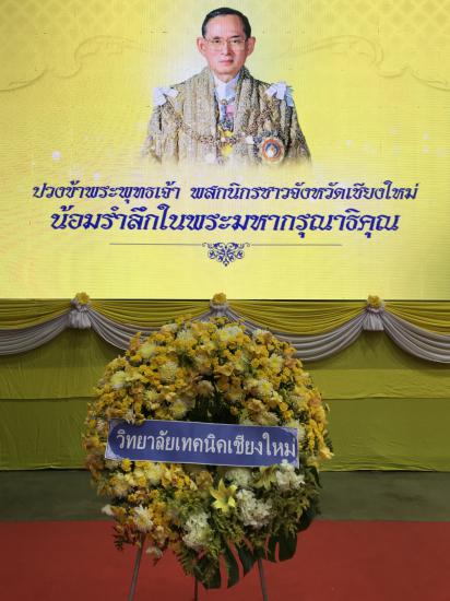 วันที่ 13 ตุลาคม 2563 ผู้อำนวยการวิทยาลัยเทคนิคเชียงใหม่ มอบหมายให้ รองฯ ชรันต์ยุทธ์ บุญยง ฝ่ายพัฒนากิจการนักเรียนนักศึกษา นำคณะครูแผนกวิชาช่างเชื่อมโลหะ แผนกวิชาช่างเทคนิคอุตสาหกรรม และแผนกวิชาช่างยนต์ ร่วมพิธีวางพวงมาลาและถวายบังคม ในพิธีน้อมรำลึกเนื่องในวันสวรรคต พระบาทสมเด็จพระบรมชนกาธิเบศร มหาภูมิพลอดุลยเดชมหาราช บรมนาถบพิตร 13 ตุลาคม 2563 ณ ศูนย์ประชุมและแสดงสินค้านานาชาติเฉลิมพระเกียรติ 7 รอบ พระชนมพรรษา เชียงใหม่