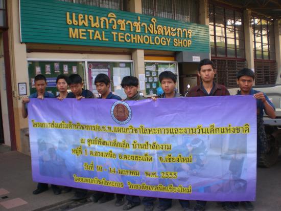 ) แผนกวิชาโลหะการ วิทยาลัยเทคนิคเชียงใหม่ ได้จัดทำโครงการออกค่าย อชท.และจัดงานวันเด็กประจำปี 2555 ณ โรงเรียนบ้านป่าสักงาม ต.ลวงเหนือ อ.ดอยสะเก็ด จ.เชียงใหม่ วันที่ 9 - 14 มกราคม 2555 กิจกรรมมีดังนี้ ทาสีอาคาร สอน และซ่อมมุ้งลวด ซ่อมปั้มน้ำ ซ่อมและทำสีสนามเด็กเล่น มอบของขวัญให้เด็ก ทำกิจกรรมวันเด็ก ดูภาพกิจกรรม.. |